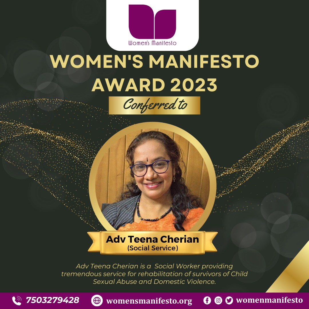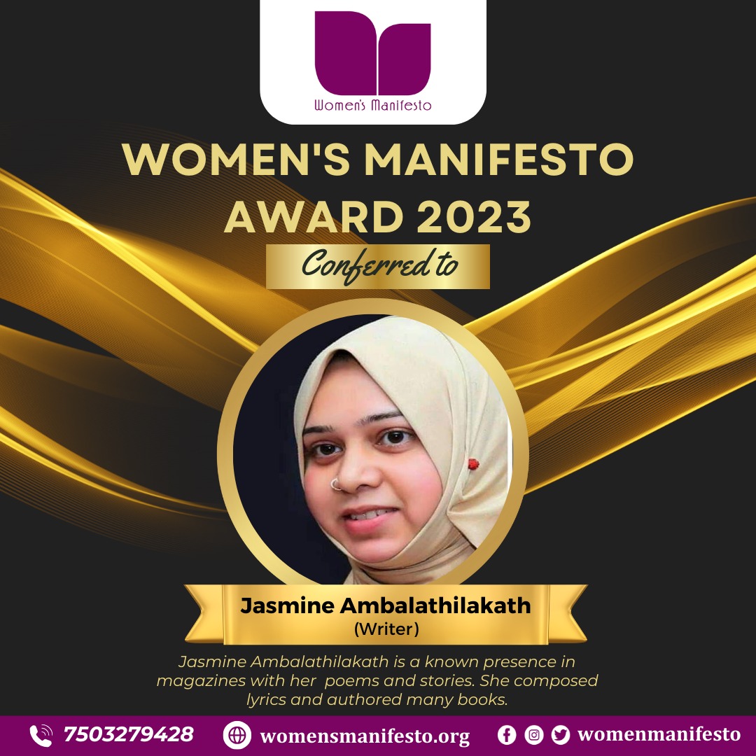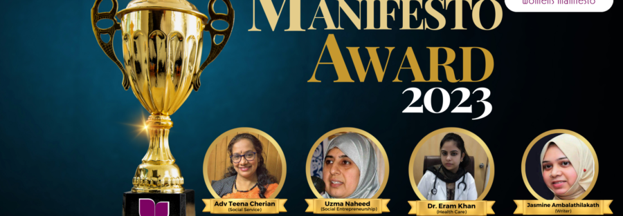 Women’s Manifesto Award 2023 conferred to Adv Teena Cherian, Uzma Naheed, Dr. Eram Khan,Jasmine Ambalathilakath 8 March 2024 New Delhi Women’s Manifesto is a national level organization initiated by women in 2014, Since its formation it engages in various activities for empowerment of women and welfare of society. To recognize efforts made by women or women managed organizations for rendering distinguished services for the cause of women and development of the nation, Women’s Manifesto confers Women’s Manifesto Award. It is given considering their excellence in the areas of entrepreneurship/ journalism/ art & culture/ academics/ sports/ literature/ social service. Awardees are selected from the nomination received and shortlisted after verification of information provided. Then it is finalized and selected by a team of three jury members. The candidate will be awarded with memento; certificate and cash prize of rupees ten thousand.
